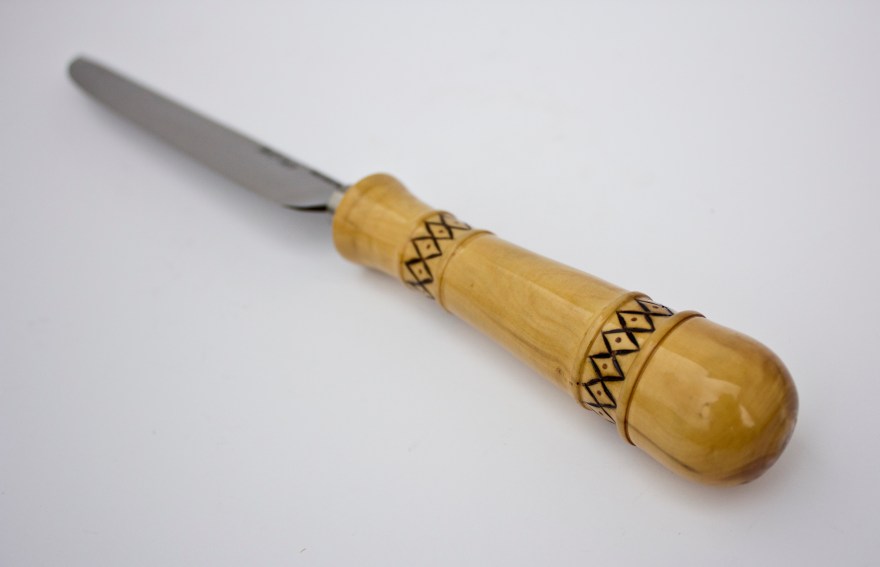 Realizados en madeira de  buxo e aceiro inoxidable, a particularidade é que cada un deles leva distintas pirografías no mango. Un ornamento diferente para unha peza única, e que amosa así de fermosa.